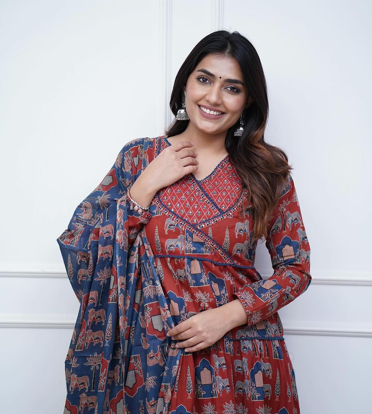 Women Red Floral Printed Anarkali Kurti Pant & Dupatta Set